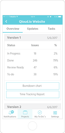 Clients get an insight to project by showing number and percentage of types of issues in current version or sprint. Coming up in new version are also charts.